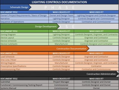 Lighting Controls Designers work with many different types of documents, some of which may be created by the designer, some by the manufacturer, and others by third parties. This paper will quickly describe each document, why it is used, and who is often responsible for creating the document. There are four design phases in which these documents are utilized…